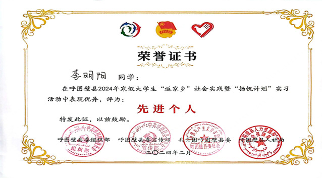 志愿服务队成员李明阳被共青团昌吉回族自治州委员会评为社会实践先进个人,被中共呼图壁县委员会组织部、中共呼图壁县委员会宣传部、共青团呼图壁县委员会和呼图壁县人力资源和社会保障局评为社会实践先进个人。